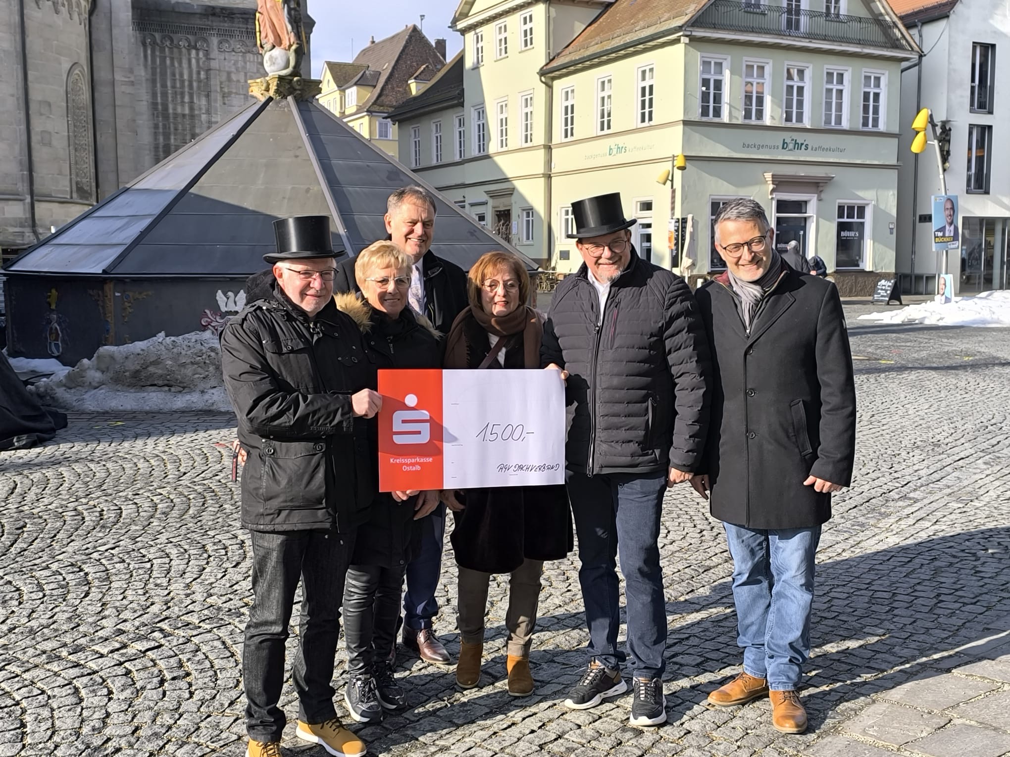 Bei der erfolgreichen AGV-Verkaufsaktion von „Alois Ansteck-Pins“ und dem Buch „Zylinder und Johannisturm – 150 Jahre Altersgenossenfest“ kam ein stolzer Betrag in Höhe von 1.500 Euro zusammen. Dieser Betrag wurde Anfang Februar als Spende zugunsten der dringend notwendigen Restaurierung des Marienbrunnens direkt vor Ort am Brunnen an Oberbürgermeister Richard Arnold und Vertreter der Gmünder Bürgerstiftung übergeben.