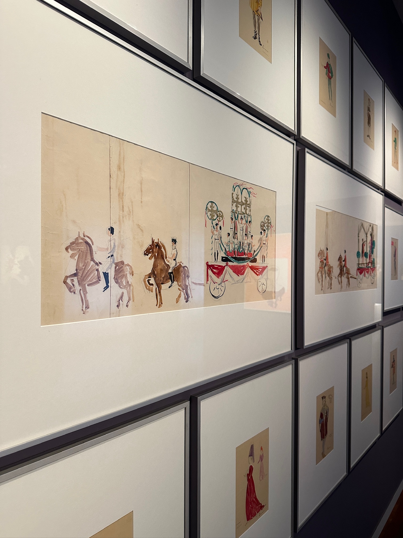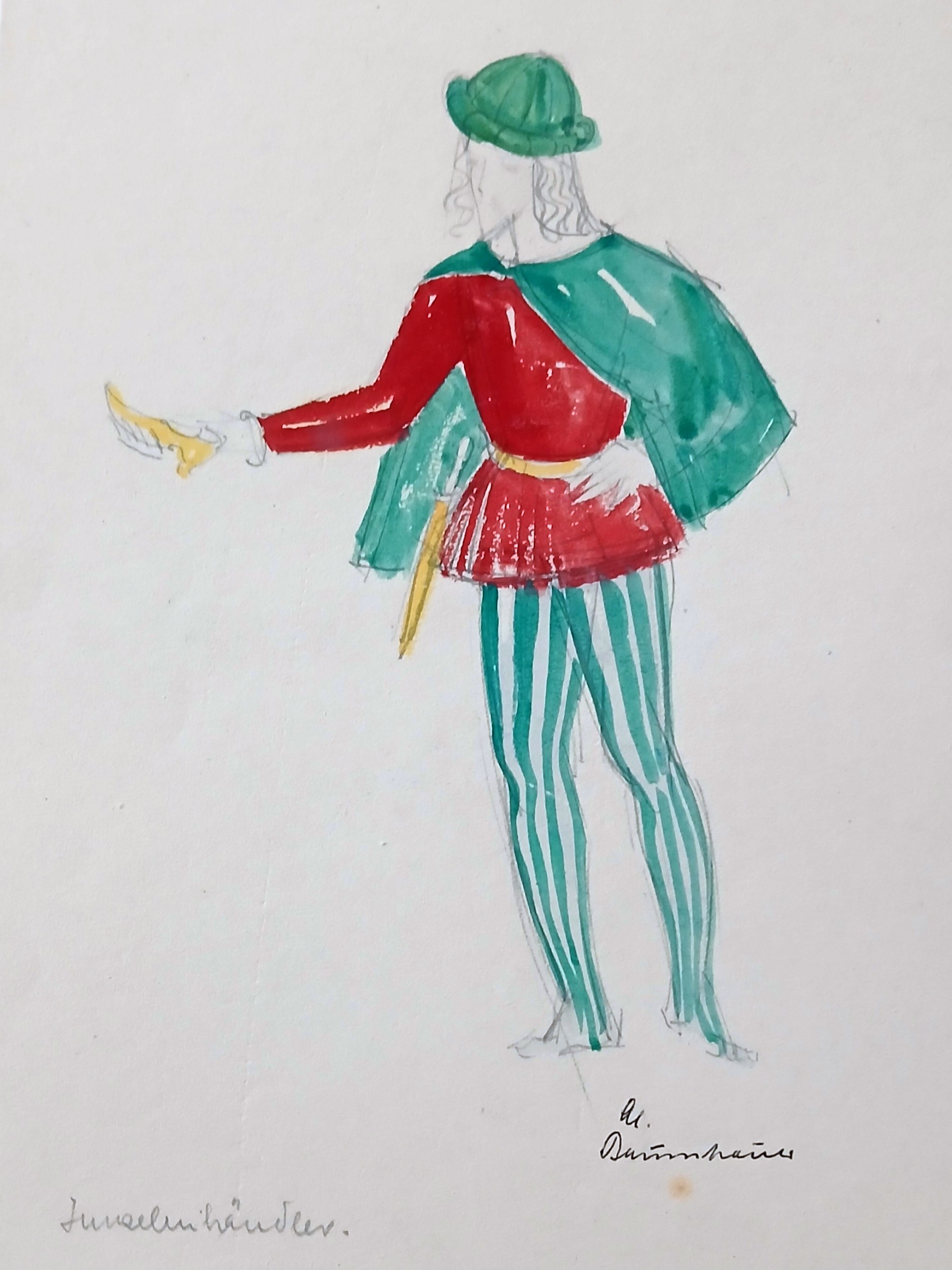 In seiner druckgrafischen Folge zu Odysseus setzt sich Sepp Baumhauer mit Szenen der griechischen Mythologie auseinander, beispielsweise dem Parisurteil. Hauptaugenmerk bei den Radierungen ist jedoch die Beschäftigung mit Körpern im Raum und der Versuch, mit Schraffur, Punktierung oder der bloßen Linie ein Höchstmaß an Plastizität zu erreichen. Sein Vater widmete sich in farbenfrohen und fantasievollen Entwürfen einem lokalen Mythos: dem Geiger zu Gmünd. Die Verwurzelung der Legende in der Gold- und Silberstadt spiegelt sich in Kostümen wie dem für den Goldschmiedemeister wider.