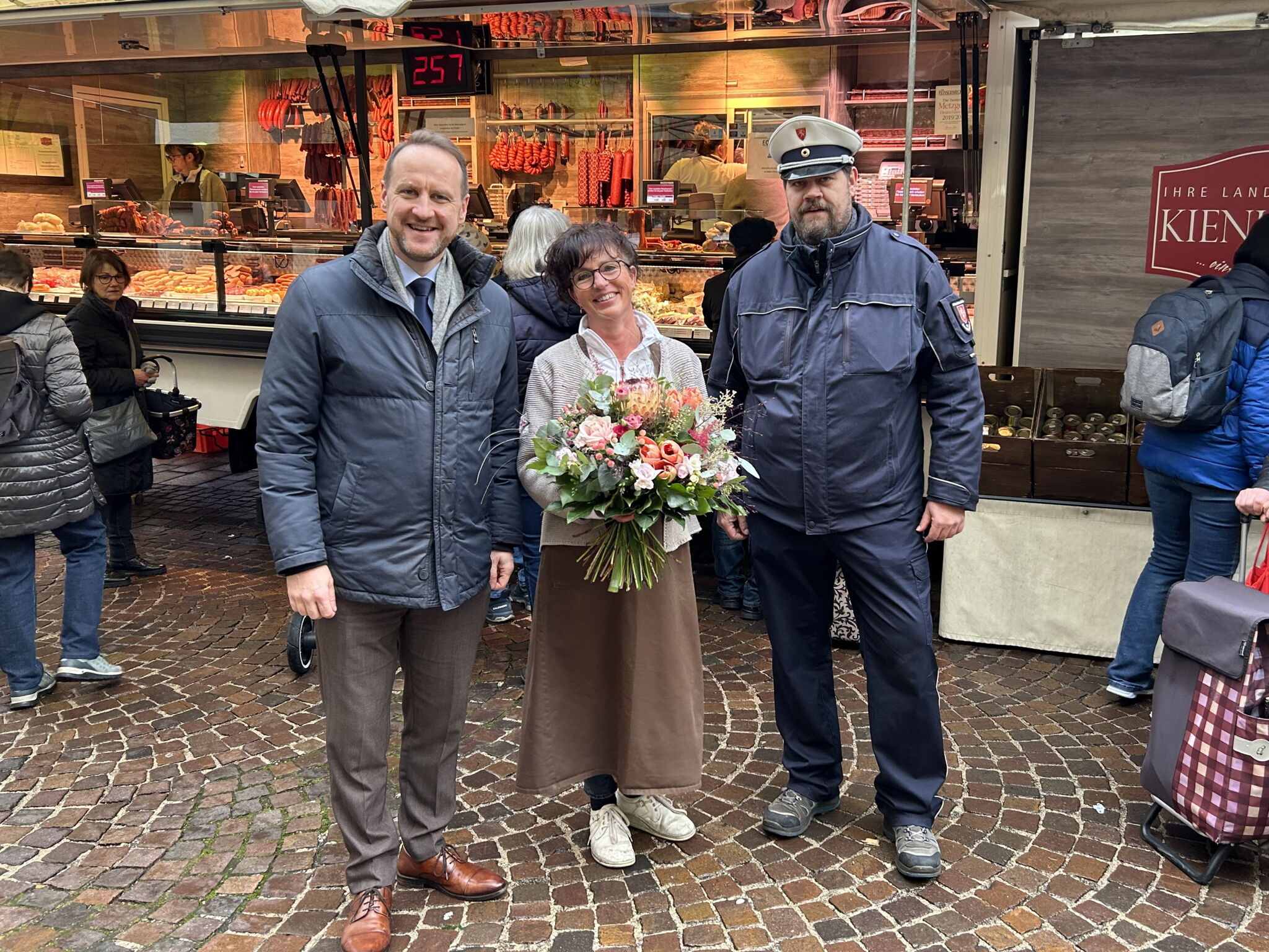 Zum Abschied überreichte Christian Baron stellvertretend für Karin und Wolfgang Kienhöfer einen Blumenstrauß an die langjährige Mitarbeiterin Heidi Scheppach, die den Stand über viele Jahre hinweg mit geprägt hat. Der Familie Kienhöfer wünschte er alles Gute für die Zukunft.