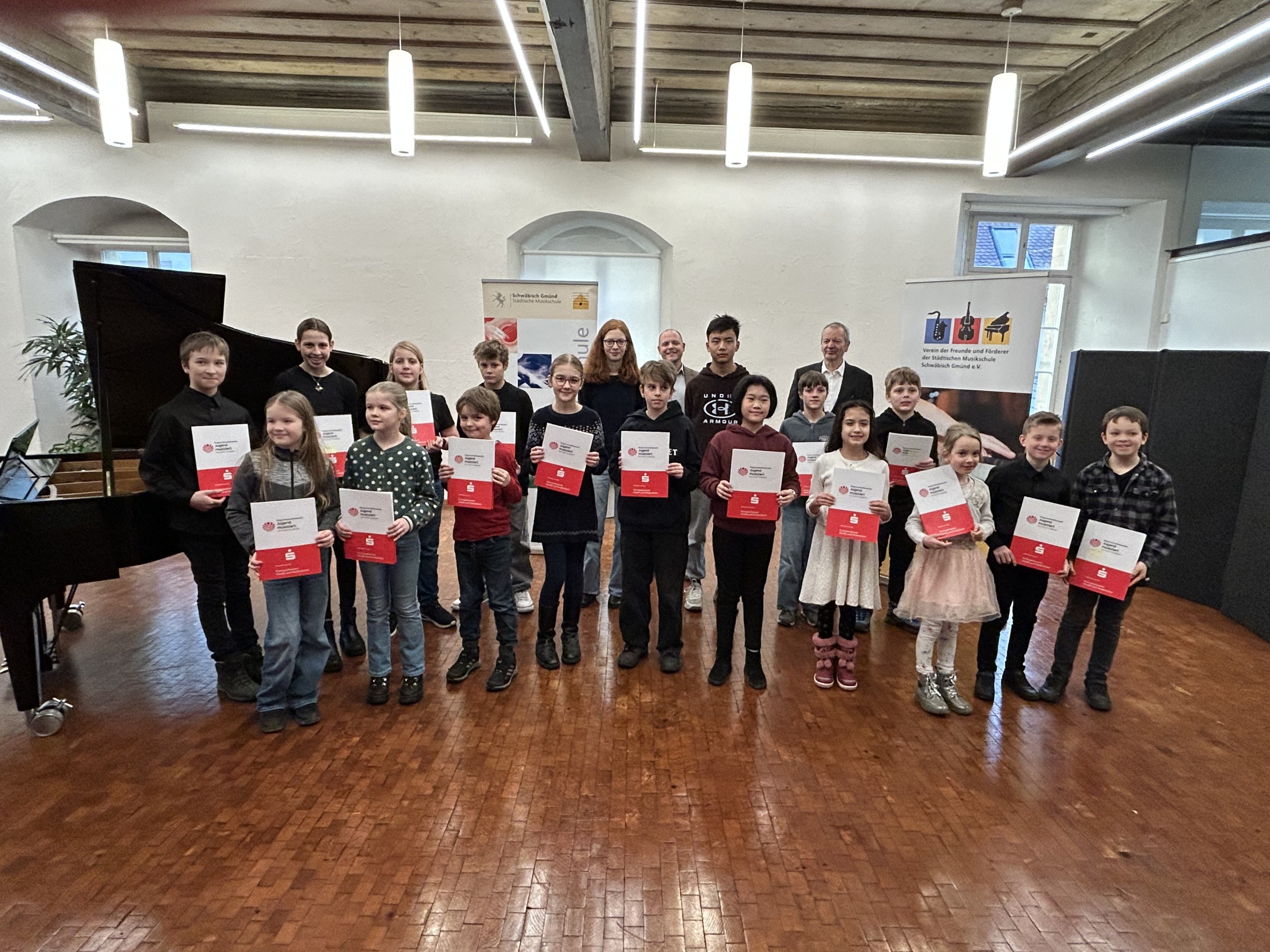 Strahlende Gesichter und viel Applaus prägten die feierliche Urkundenübergabe des Regionalwettbewerbs „Jugend musiziert“ im Schwörsaal der Städtischen Musikschule Schwäbisch Gmünd. Musikschulleiter Christian Wolf überreichte die Auszeichnungen persönlich und würdigte das Engagement aller Beteiligten: „Hinter jedem erfolgreichen Auftritt steht nicht nur intensives Üben, sondern auch die Unterstützung durch Eltern und Lehrkräfte. Dieses gemeinsame Engagement macht unsere Musikschule stark.“