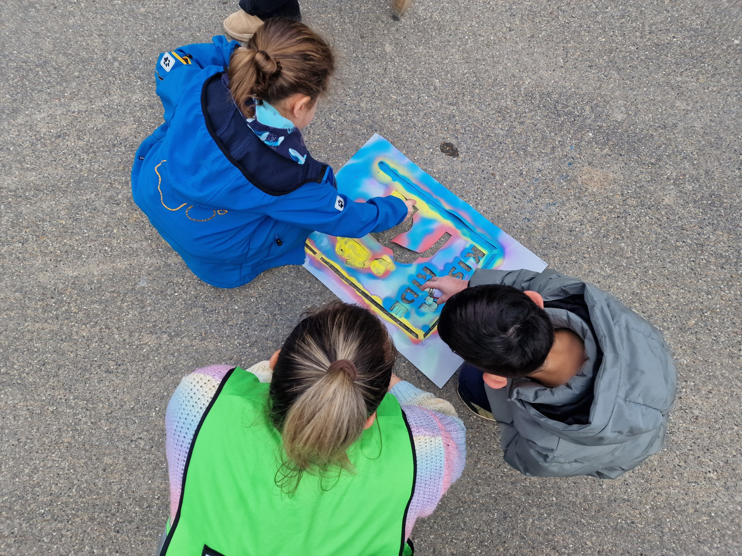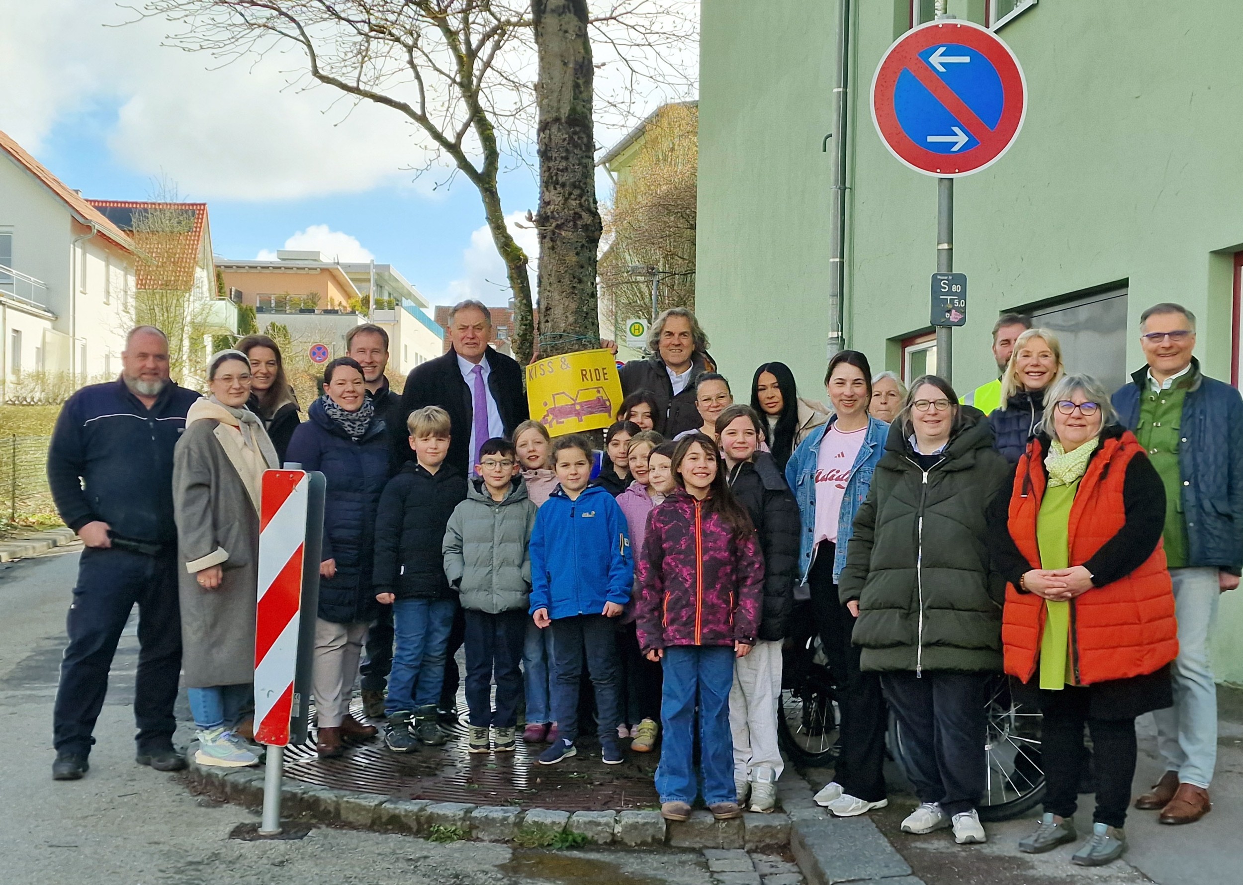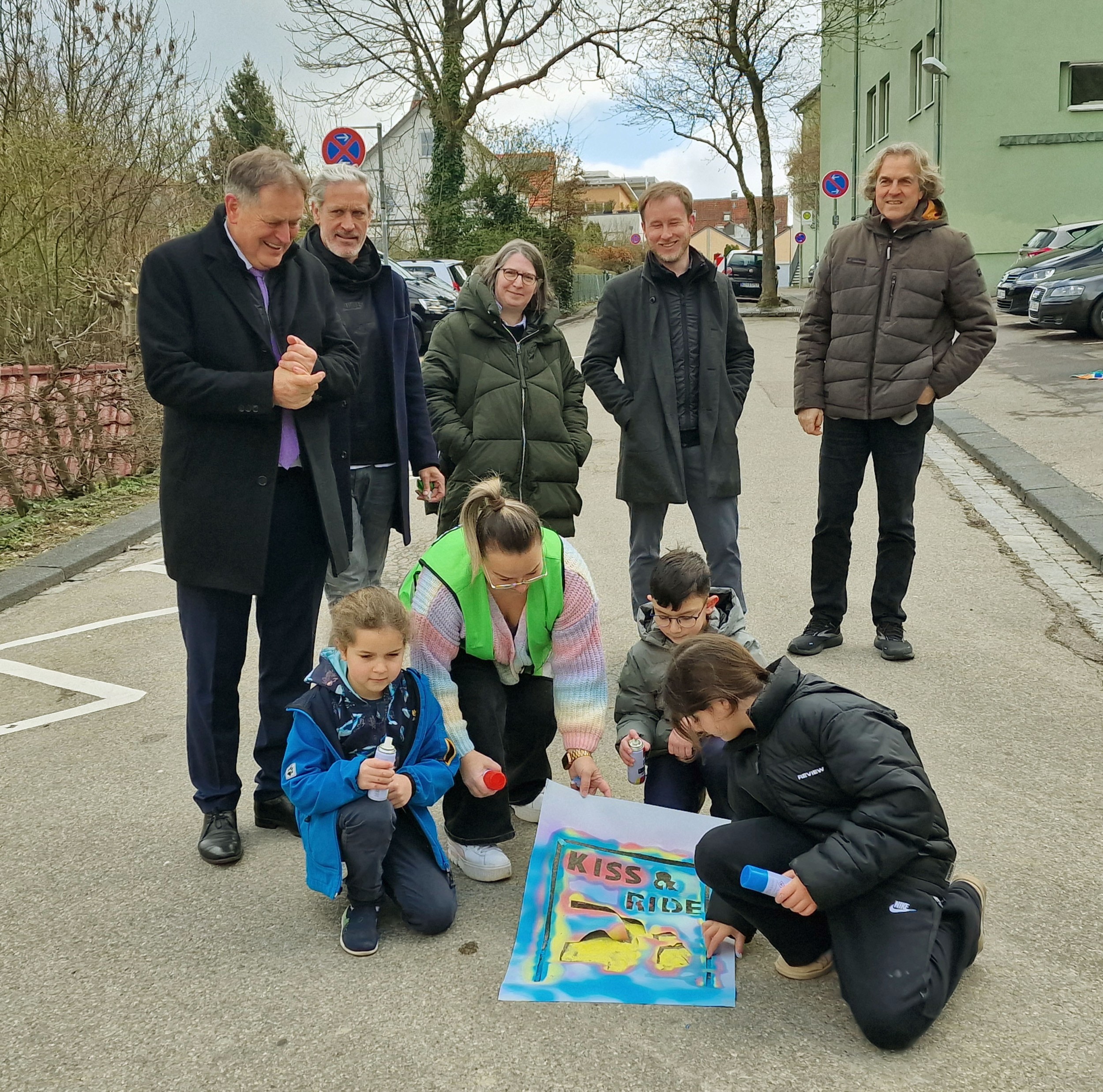 Mit einer offiziellen Feier wurde am Freitag, 27. März, das neue Kinderhaus „Kunterbunt“ in der Rauchbeinstraße 4 offiziell eröffnet. Zahlreiche Gäste aus Verwaltung, Gemeinderat, beteiligten Institutionen sowie Kindergartenleitung, Betreuungskräfte und Kindergartenkinder und Vertreterinnen und Vertreter der Elternschaft nahmen an der Kindergarteneinweihung teil. Zuvor besprühten Schülerinnen und Schüler der Rauchbeinschule "Kiss & Ride" Hinweise auf die Straße, um auf die gemeinsame Verkehrssituation der Schule und dem Kindergarten hinzuweisen. Der Schulleiterin der Rauchbeinschule, Dr. Karin Schwarz, war es wichtig, auf die Verkehrssituation hinzuweisen und initiierte die Straßenmalaktion mit den Lehrerinnen und Lehrern und der Schülerschaft. Mit selbst gebastelten Schablonen und bunten Farben soll Aufmerksamkeit geschaffen werden für Fußgänger und Autofahrer.
