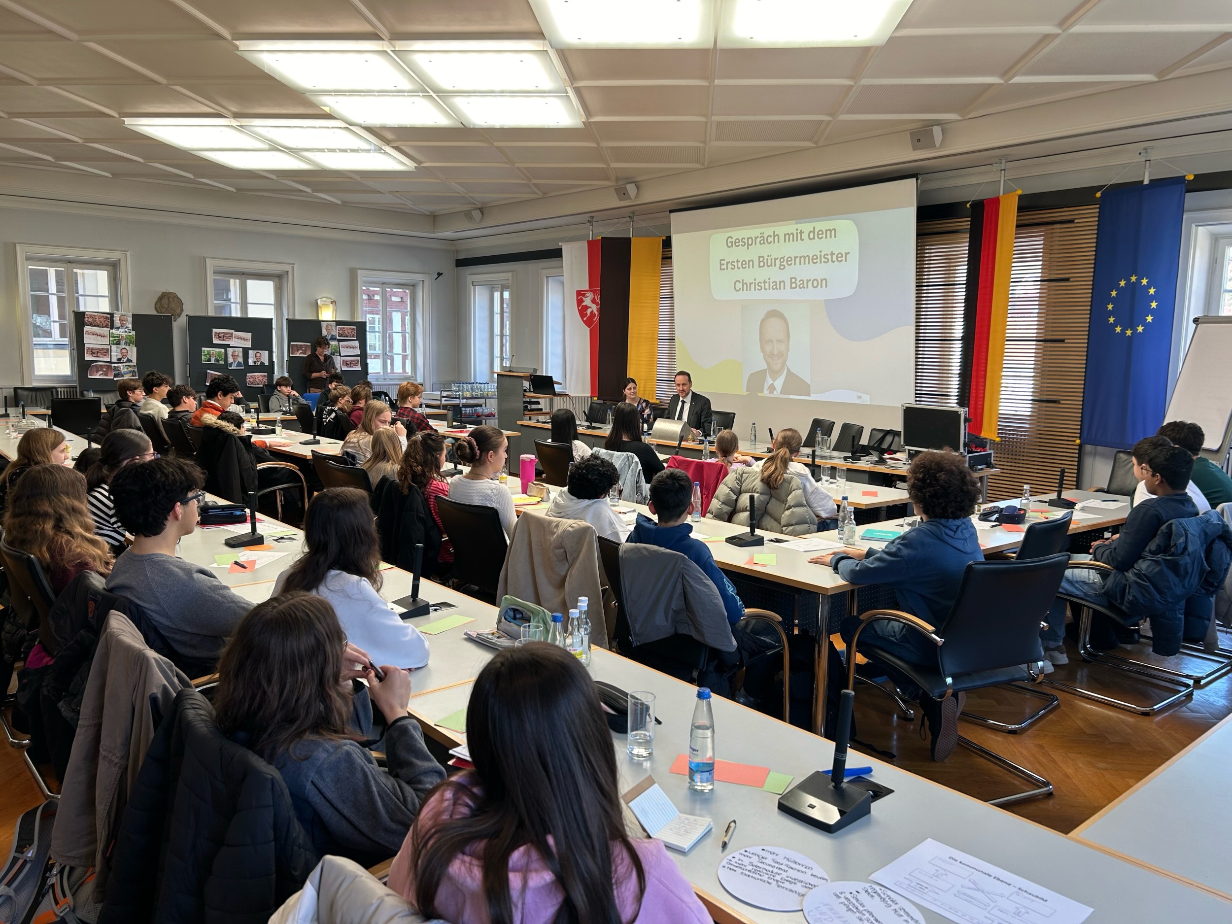 Am Freitag, 13. März, empfing der Erste Bürgermeister Christian Baron zahlreiche Schülerinnen und Schüler der Klassenstufe 8 des Parler-Gymnasiums im großen Sitzungssaal des Gmünder Rathauses. Der Workshop „Schule trifft Rathaus“ in Kooperation mit der Landeszentrale für politische Bildung gab der Klasse die Möglichkeit, hinter die Kulissen der Stadtpolitik zu schauen und Einblicke in die kommunale Welt zu bekommen.