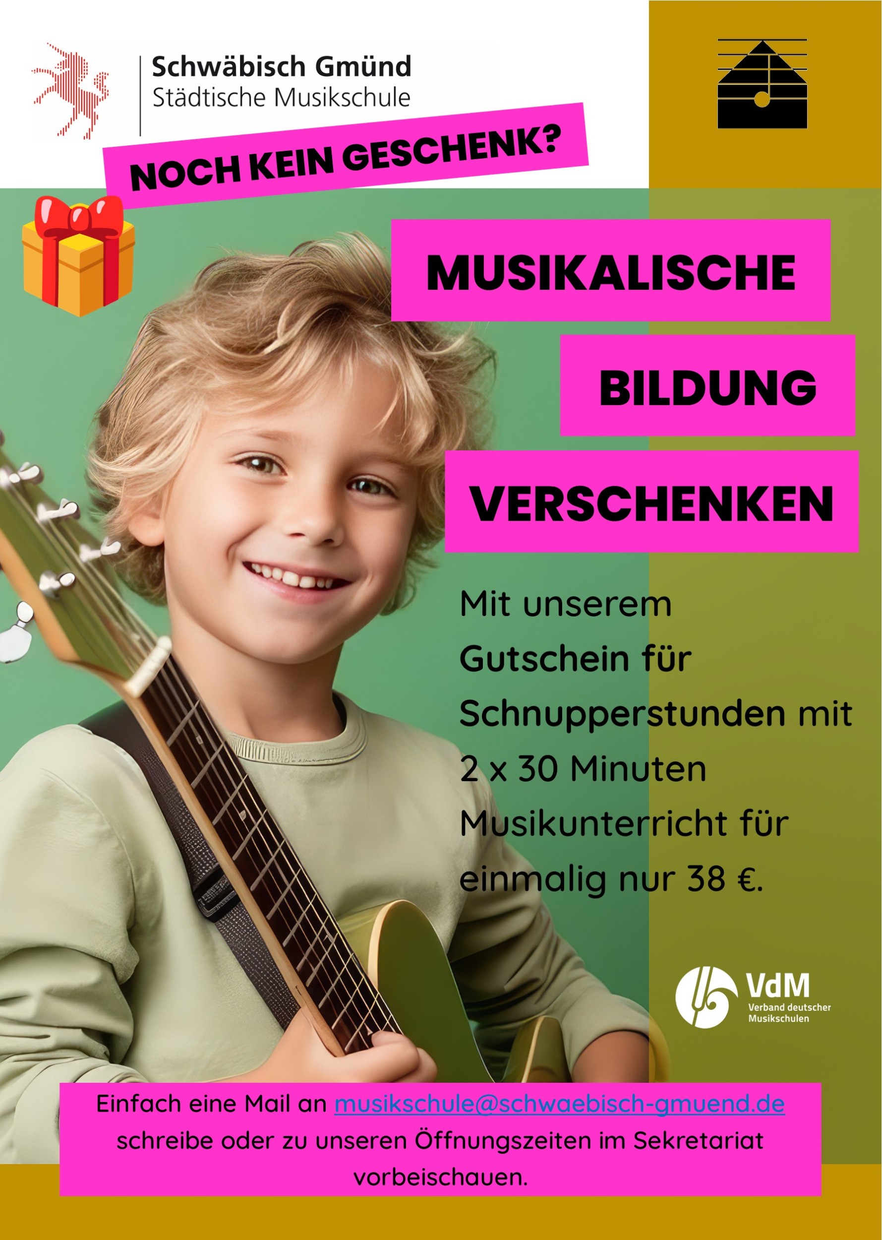 Ihr wollt die Schnupperstunden zu Weihnachten verschenken? Dazu einfach eine Mail mit der Bitte um eine Gutscheinausstellung an musikschule@schwaebisch-gmuend.de senden oder im Büro der Musikschule zu den Öffnungszeiten vorbeikommen. Der Gutschein kann dann entweder direkt mitgenommen oder auch per Mail zum selbst ausdrucken versandt werden. Ein kreatives Geschenk unter eurem Weihnachtsbaum, dass musikalische Vorfreude hervorbringt.