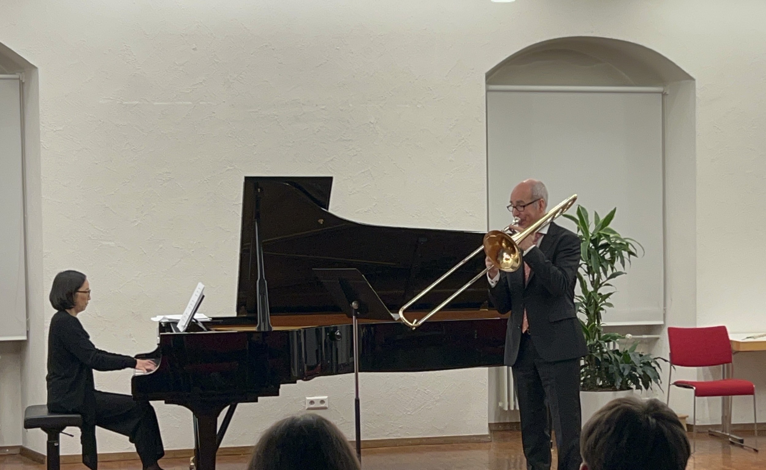 Henning Wiegräbe, Professor für Posaune an der Stuttgarter Musikhochschule, überzeugte mit seinem warmen, facettenreichen Ton und seinem souveränen Spiel zwischen Virtuosität und musikalischer Tiefe. Gemeinsam mit Tayuko Nakao-Seibert am Klavier gestaltete er die stilistische Vielfalt des Programms mit Brillanz, rhythmischer Präzision und großer Spielfreude – vom swingenden Gershwin bis zu den tänzerischen Werken Piazzollas.
