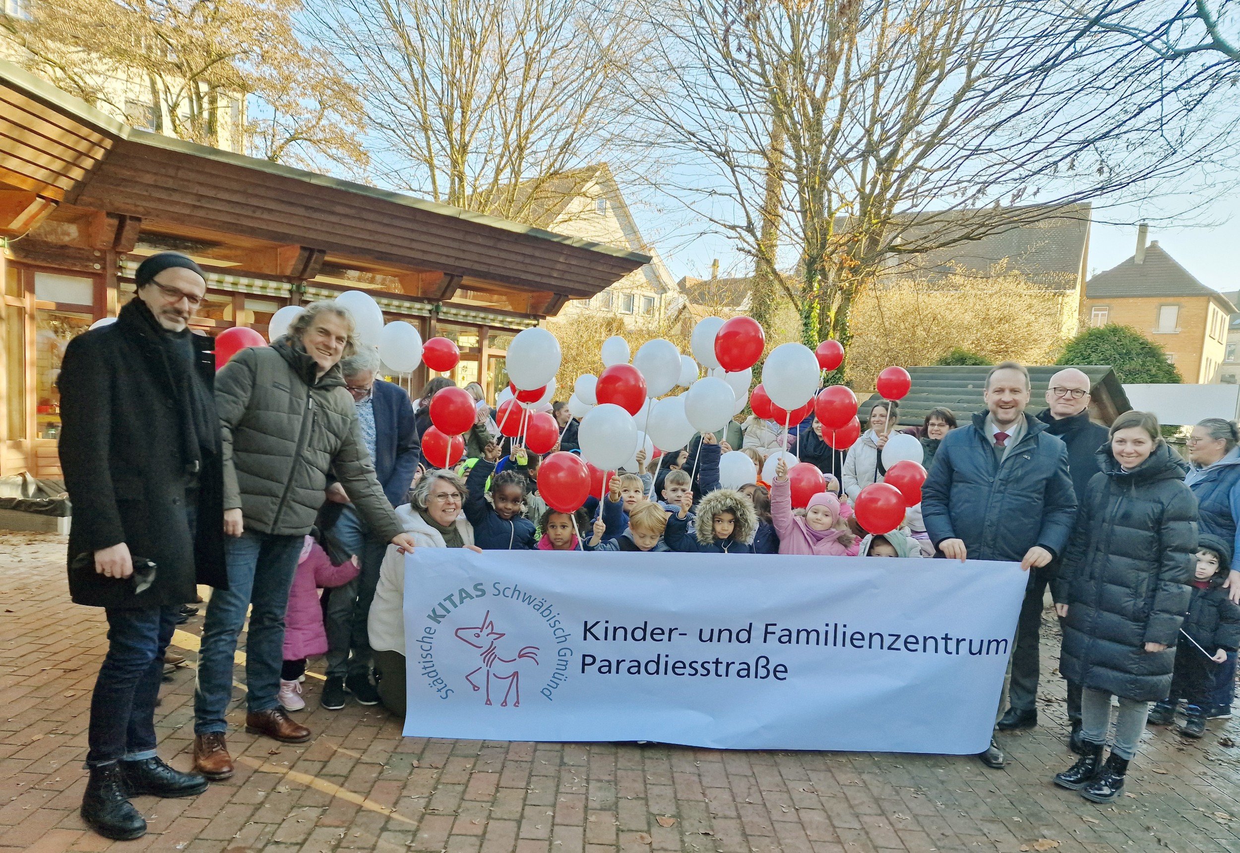 Die Kinder sorgten mit roten und weißen Luftballons – ganz in den Stadtfarben – für einen fröhlichen Empfang und stimmten passend zum Anlass das Lied „Komm doch mal zu uns ins Haus“ an.