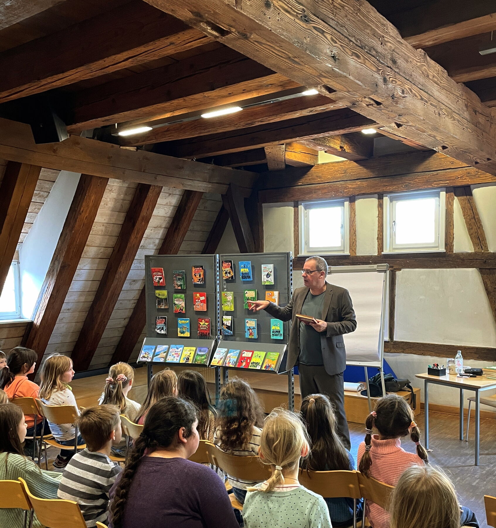 Am Donnerstag, 26. Februar, war der Kinderbuchautor Rüdiger Bertram zu Gast in der Gmünder Stadtbibliothek. Für die Drittklässlerinnen und Drittklässler der Römerschule Straßdorf las er aus seiner beliebten Buchreihe „Stinktier & Co“, erzählte, wie die Geschichten entstanden sind, und griff sogar selbst zum Stift, um Figuren direkt vor den Augen der Kinder zu zeichnen.